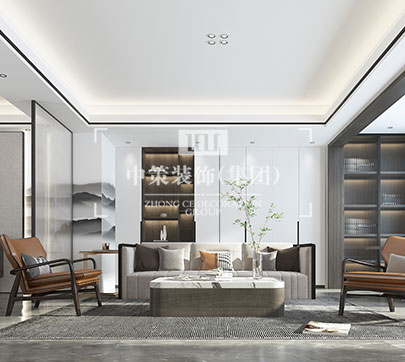 本案设计师将唐朝诗人王勃的“ 落霞与孤鹜齐飞,秋水共长天一色”一诗融入客厅之中。抹去了传统客厅电视,选用了一幅颇具朦胧美的山水人文画作。浓郁的书香气息突显温润质感,让整个空间的氛围充满了文艺气质的格调。