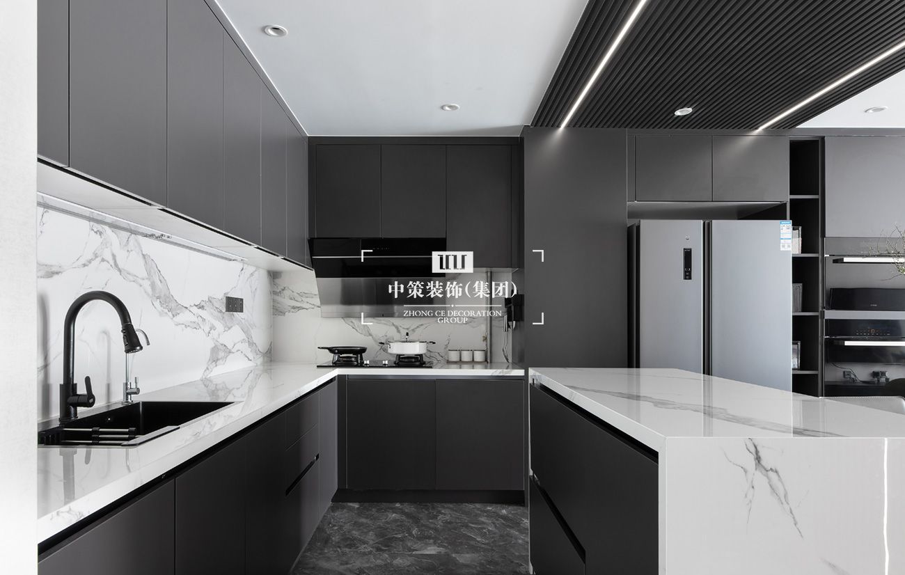 1.厨房:开放式厨房的设计,优化了采光通风的布局结构,让客餐厨空间整体更加通透。厨房大面积的岩板运用,搭配线性灯造型的过度,让厨房与餐厅的品质感直线提升。