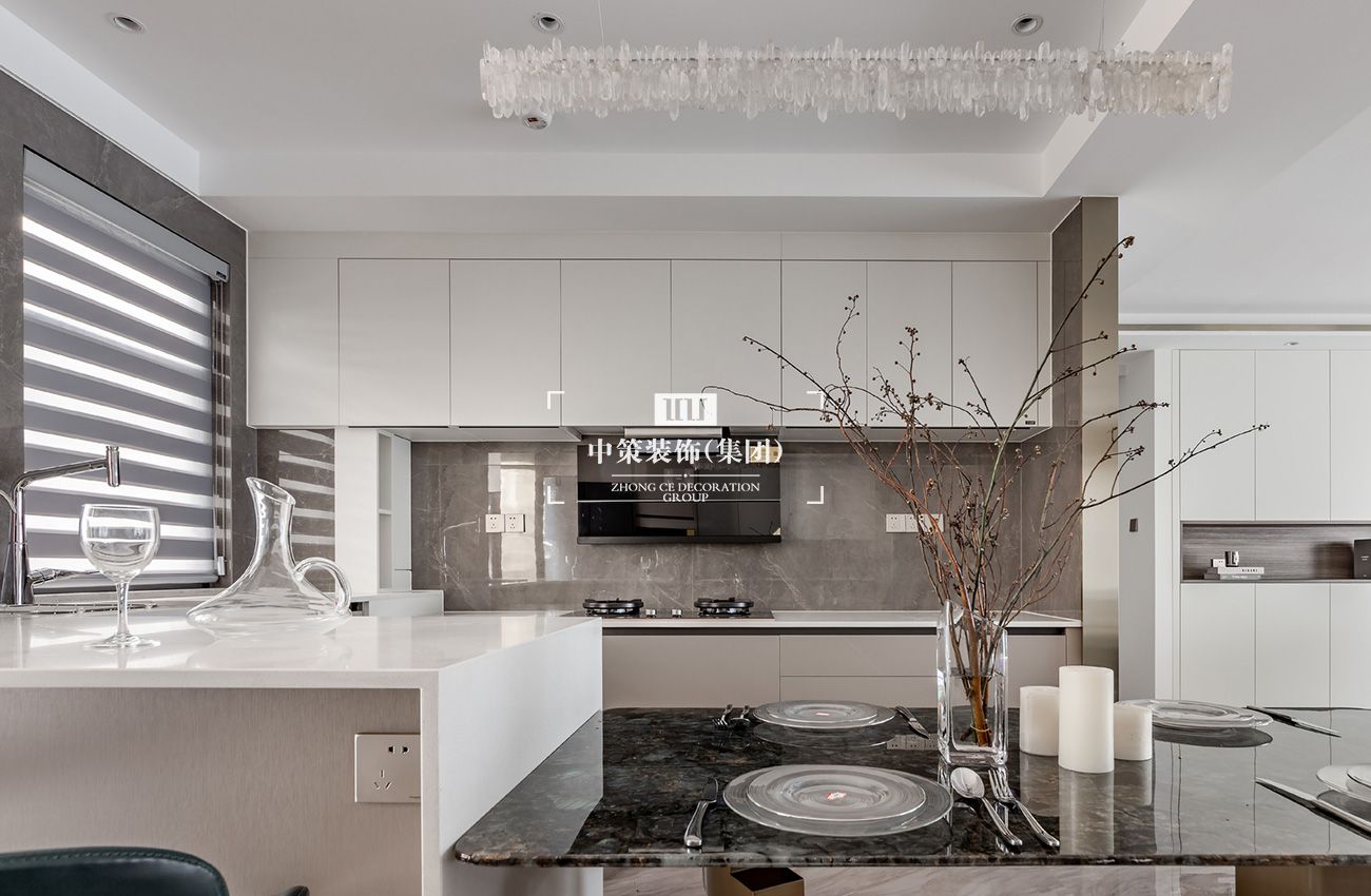 2.厨房:采用开放式设计,将所有空间最大化利用。加装了岛台的设计,使用更加便捷。餐边柜与整体效果一致,同时也满足了家庭收纳需求。