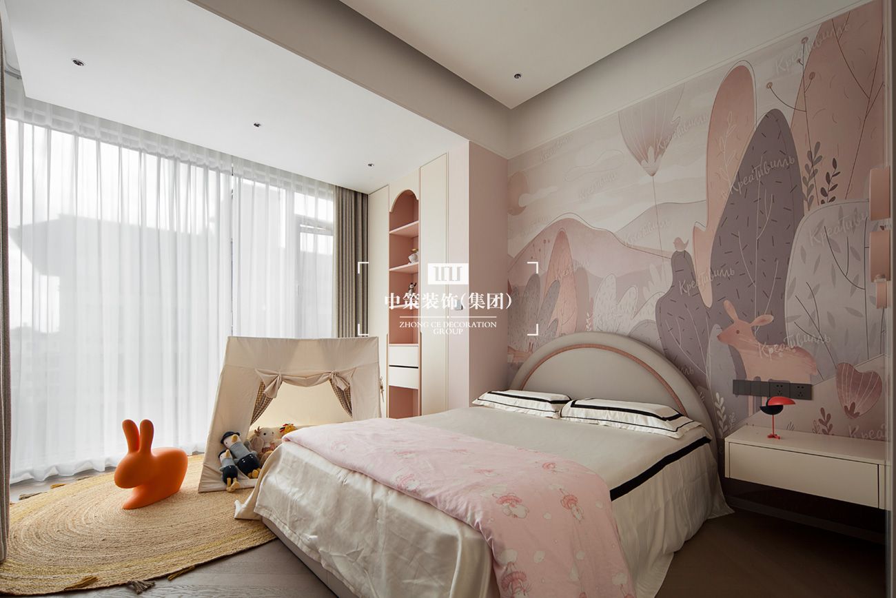 ①客厅:外侧的阳台做了拆分改动,原户型的阳台空间一分为二并入客厅和儿童房,增强其空间的使用面积。右侧的弧角采用墙板设计,在局部视线上可隐藏后方的柜体,保持客厅的整洁感。电视背景墙以简约的内嵌设计为主,木格栅的线条装饰做点缀,搭配无主灯设计还原生活的静谧。
